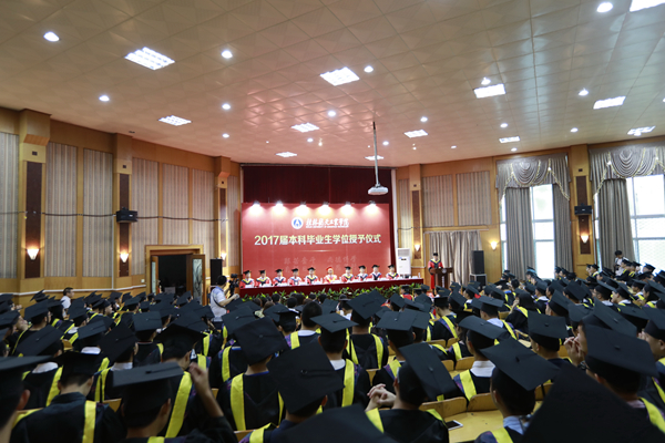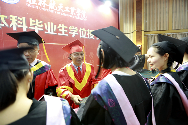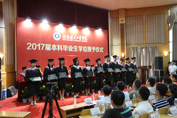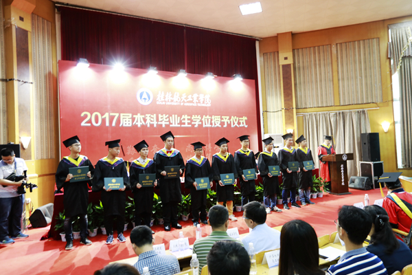 27日上午,本科生学位授予仪式在北校区2108教室举行。校领导易忠、罗延忠、郝德温、罗国湘、义祥辉、詹皖生、杨杰、李智为毕业本科生颁发学位证书,并行拨穗礼。罗延忠代表学位委员会宣读《桂林航天工业学院关于授予2017届毕业生学士学位的决定》。